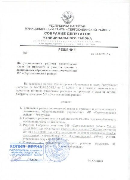 Документ об установлении размера платы, взимаемой с родителей (законных представителей)